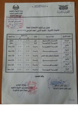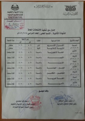 اعلنت وزارة التربية والتعليم اليوم جداول امتحانات الشهادة الثانوية للقسمين العلمي والأدبي .