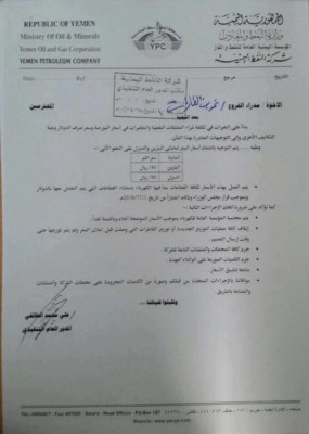 كما وجه مدير عام شركة النفط، بمحاسبة المؤسسة العامة للكهرباء، بموجب الأسعار الموضحة أعلاه، وبالقيمة نقدا، وكذا إيقاف كافة عمليات التوزيع الجديدة، أو توزيع القاطرات التي وصلت قبل إعلان السعر، ولم يتم توزيعها حتى وقت إرسال التعميم.