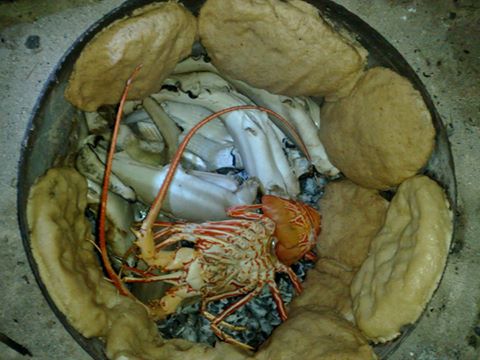 حيث يتم وضع اقراص من الذرة وسمك والأستكوزا والجنبري وبعض من ثمار البحر  بشكل واحد ثم تضرم النار حتى تنضج الوجبة .