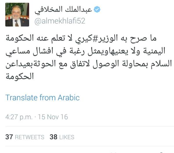 وقال عبدالملك المخلافي : ماصرح به الوزير كيري لا تعلم عنه الحكومة اليمنية ولا يعنيها ويمثل رغبة في افشال مساعي السلام بمحاولة الوصول لاتفاق مع الحوثة بعيدا عن الحكومة .