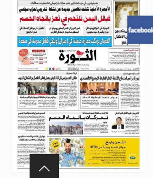 وفي عنوان على صدر صفحتها الأولى يوم أمس تضمن “قبائل اليمن تلتحم في تعز باتجاه الحسم”، وتناولت الصحيفة لقاءات القائد الميداني لمليشيا الحوثي أبو علي الحاكم مع بعض ابناء المنطقة.