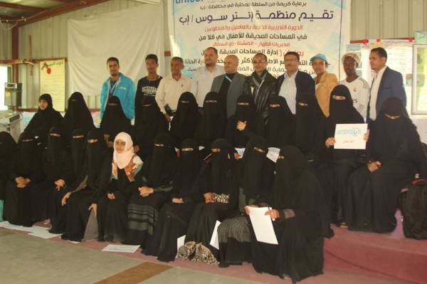 أختتم بمدينة إب الدورة الخاصة بالعاملين المتطوعين في المساحات الصديقة للأطفال في مديريات الظهار والمشنة وذي السفال والتي تقيمه منظمة أنتر سوس ضمن مشروع حماية الأطفال الممول من منظمة اليونسيف حيث أقيمت الدورة لمدة أسبوع وأستهدفت اثنين وثلاثون مشاركاً ومشاركة يمثلون اخصائيين اجتماعيين ومتطوعين والعاملين بالمساحات الصديقة في إب حيث هدفت الدورة لإكساب المشاركين على إدارة الحالة وكيفية التعامل مع الأطفال المعرضين للخطر وإدارة الحالة والتعامل مع الطفل المضطرب وآلية التدخل تجاه مشكلات الأطفال في المساحات وكيفية إكساب الطفل المهارات الحياتية , وتدرب المشاركون حول الإستراتيجية التعليمية للأطفال والصحة العامة والنظافة , وفي اليوم الختامي وزع الأستاذ رعد الضبيبي منسق المشروع